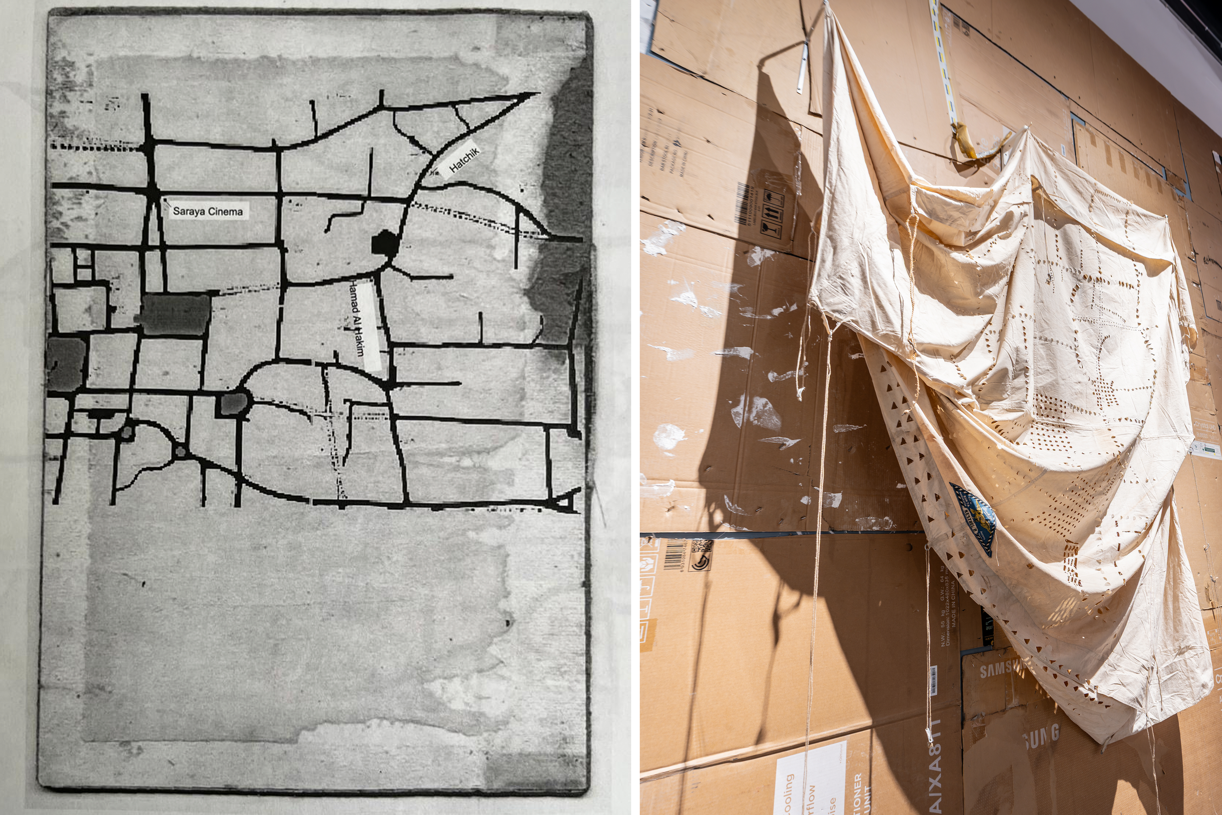 In The Map of Absence, a perforated 1960s Butka Falcon camping tent becomes a fragile cartography of memory. Tiny punctures trace the map of Suweida—Issam Kourbaj’s childhood neighbourhood—drawn by his brother, while a single charred circle marks the site of the family home. It is a map of a place that can no longer be returned to, yet resists erasure. The tent, emblem of temporary shelter, assumes a double role: both dwelling and wound, a structure that holds memory while offering no promise of repair.